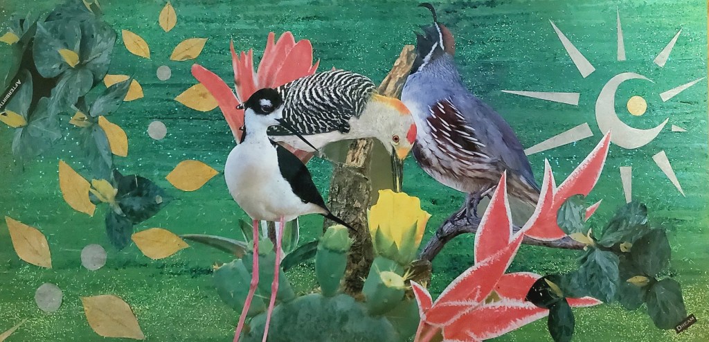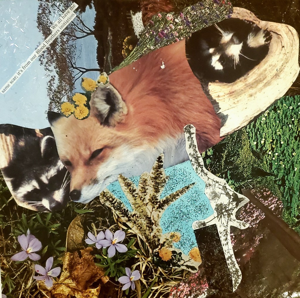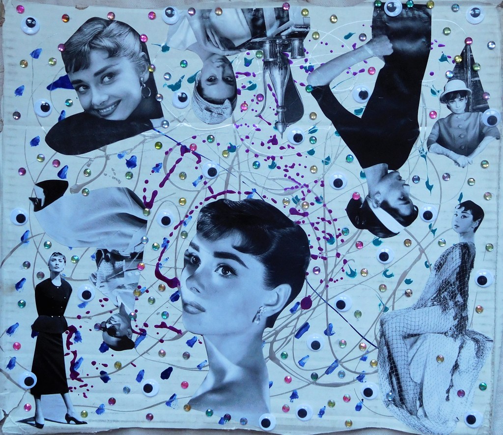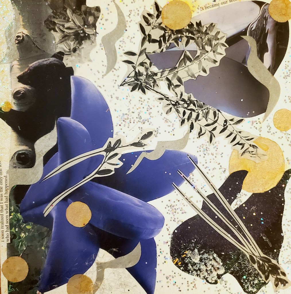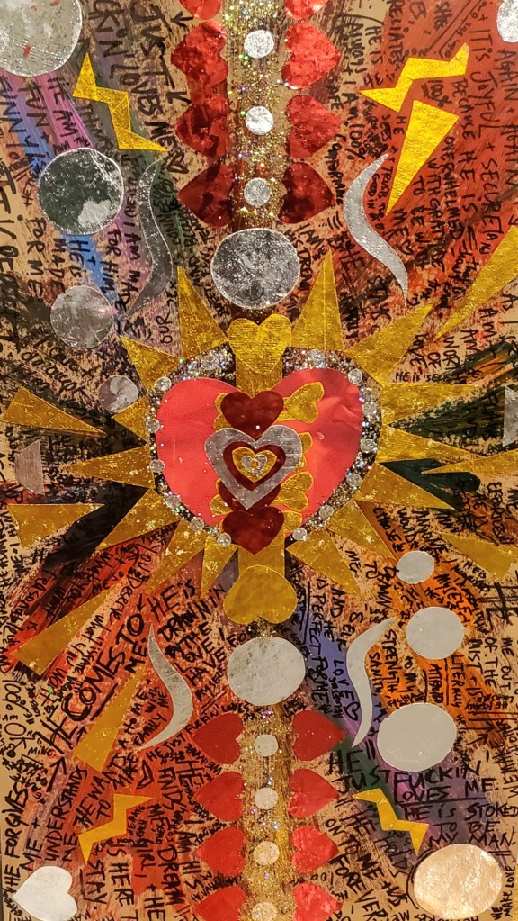 I primarily work with acrylic paints, pens, images and words from found books and magazines, glitter, and Chinese Joss paper, which is burned at alters and believed to provide ancestors money in the afterlife. These days I’ve been working on canvases and found wood, and in the past I’ve worked on found cardboard. Indeed, using found materials is important to me, as I believe in an accessible, sustainable artistic practice.