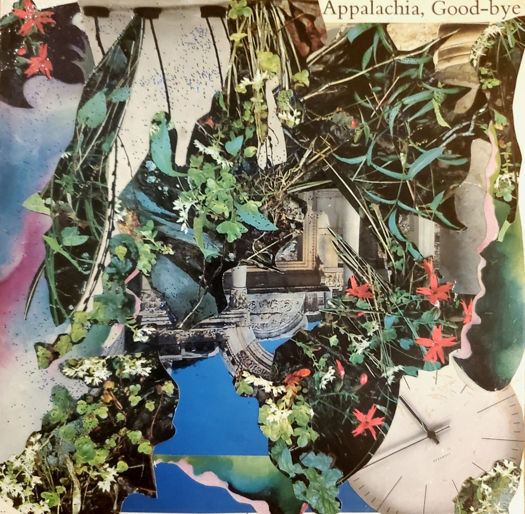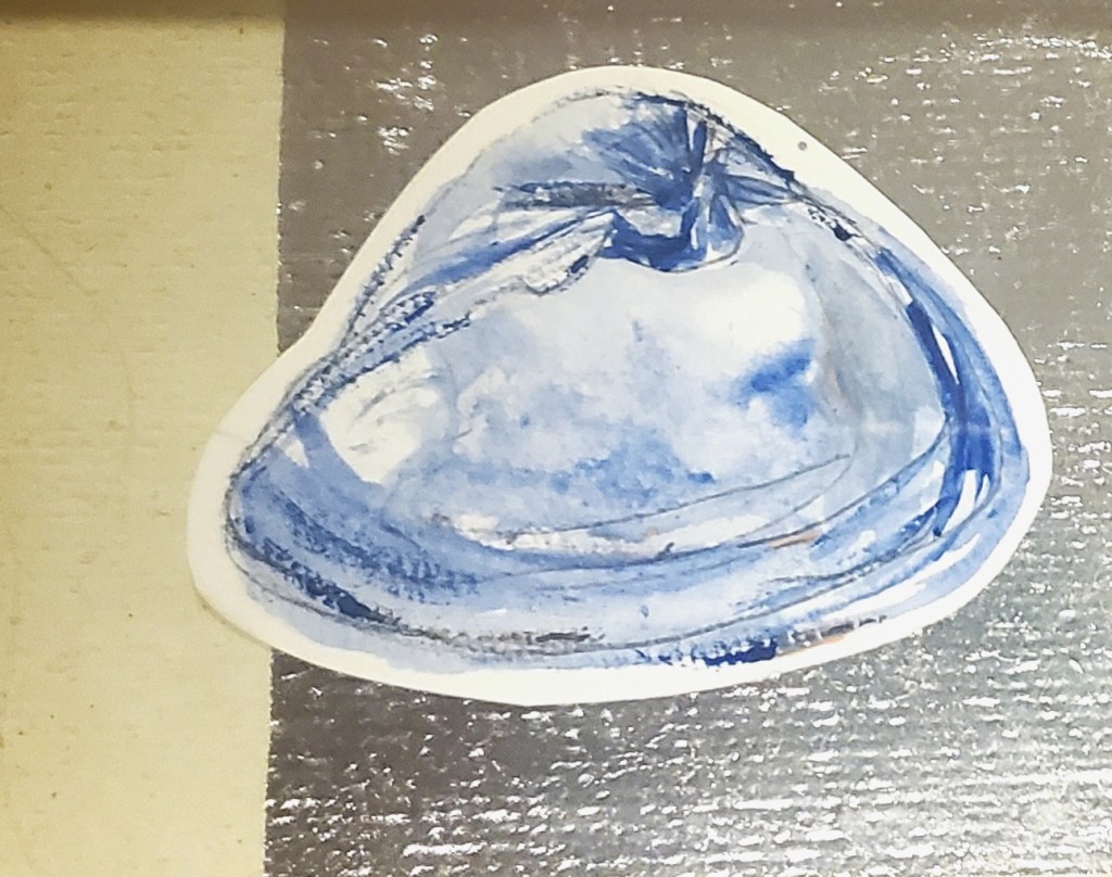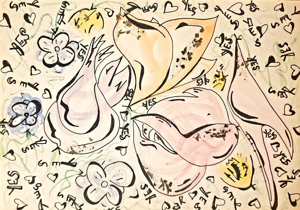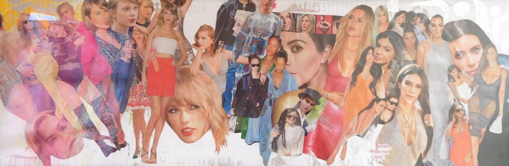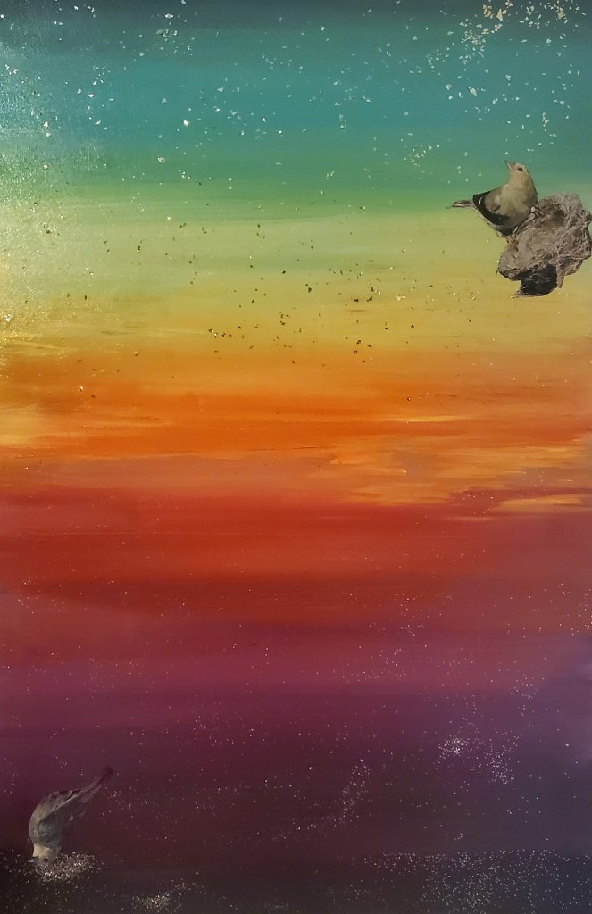 I primarily work with acrylic paints, pens, images and words from found books and magazines, glitter, and Chinese Joss paper, which is burned at alters and believed to provide ancestors money in the afterlife. These days I’ve been working on canvases and found wood, and in the past I’ve worked on found cardboard. Indeed, using found materials is important to me, as I believe in an accessible, sustainable artistic practice.